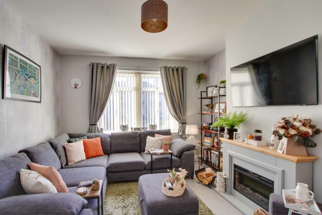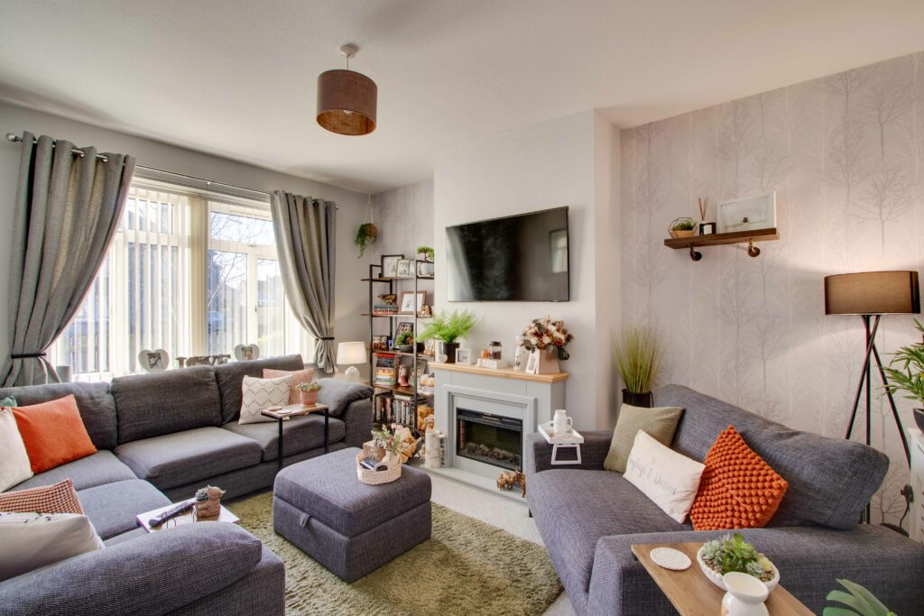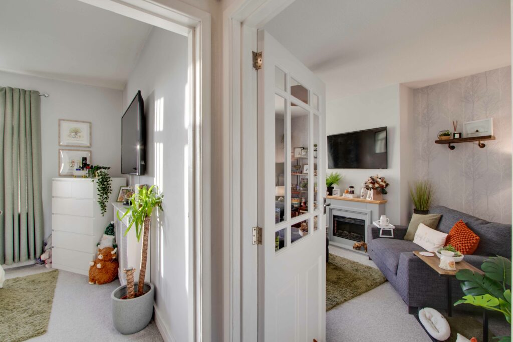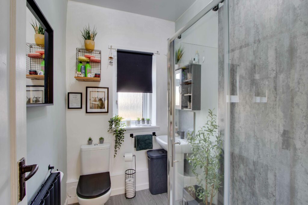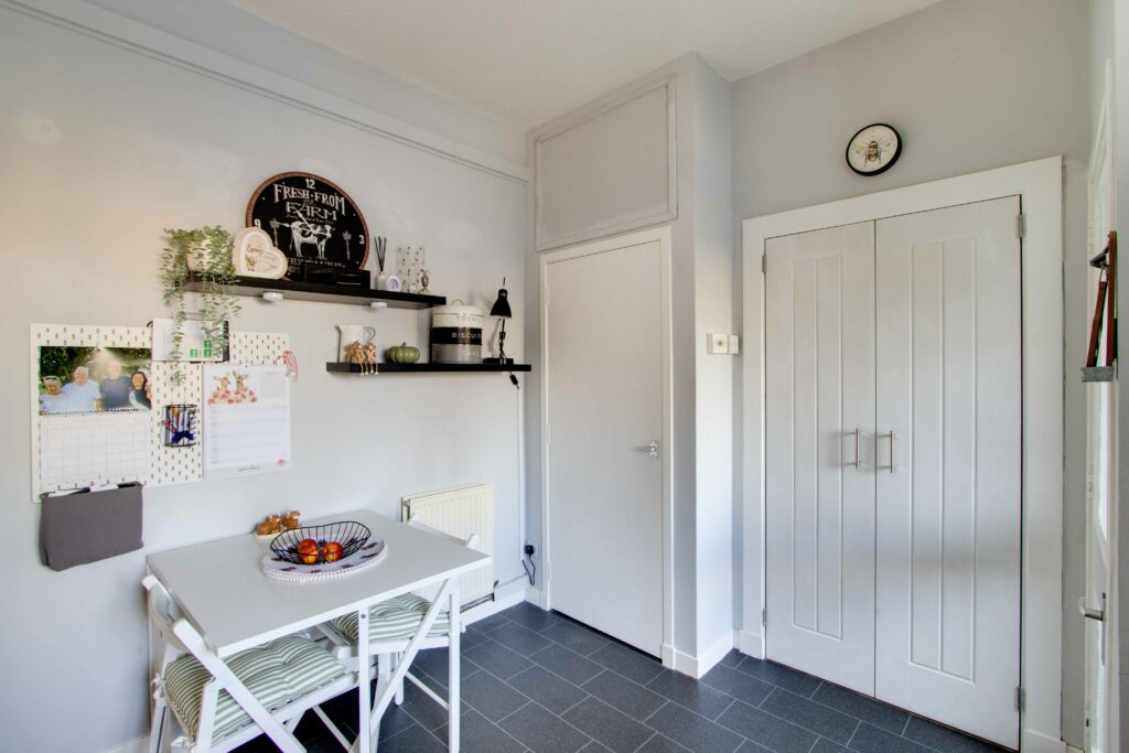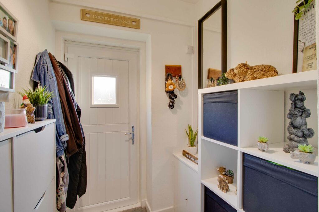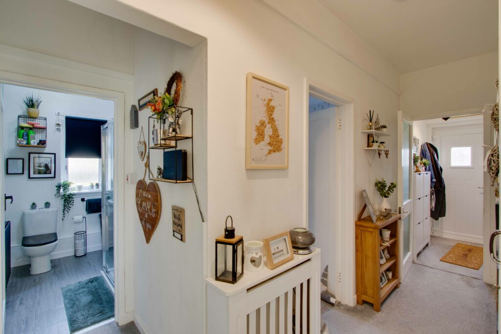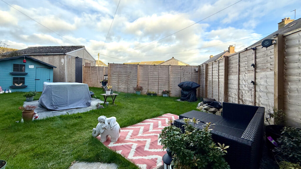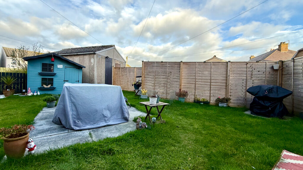 Externally, the front garden is laid to lawn with gravel chips and communal pathway (potential for off-street parking subject to planning etc). The generously proportioned and fully enclosed rear garden includes a lawn, timber shed, and brick outhouse.