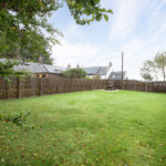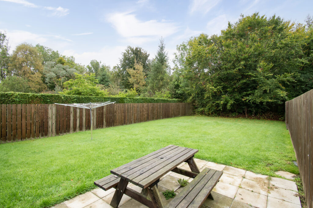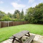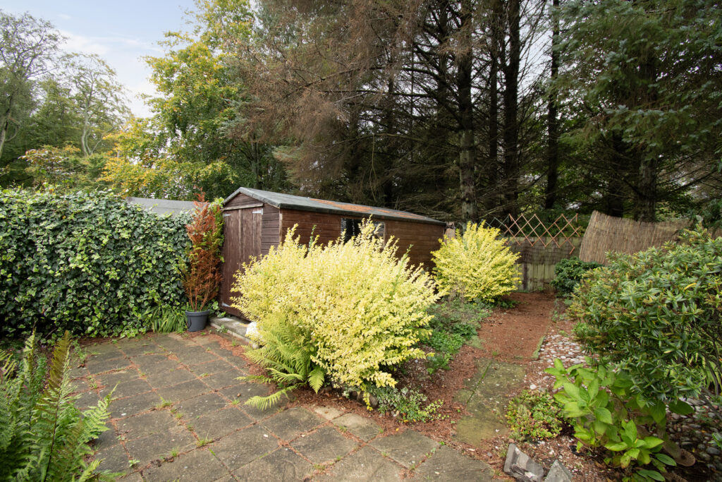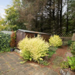 Externally, the property is approached via a communal driveway leading to a courtyard. The front garden is laid to lawn with a shrub border, while the rear garden is generously sized, featuring areas of lawn, decking, mature shrubs, and two timber sheds. An additional enclosed garden area, mainly laid to lawn with a patio, provides further outdoor space.