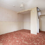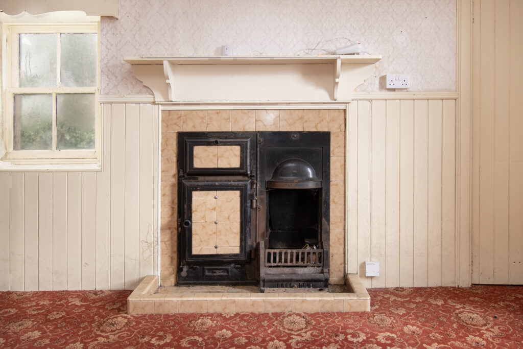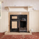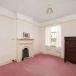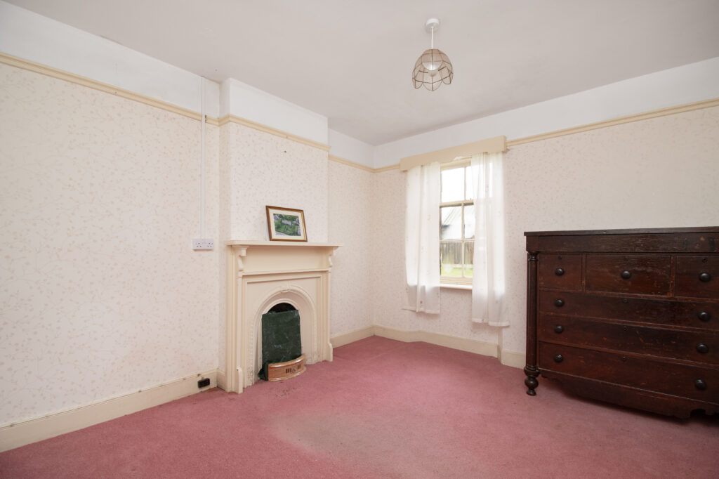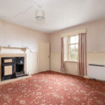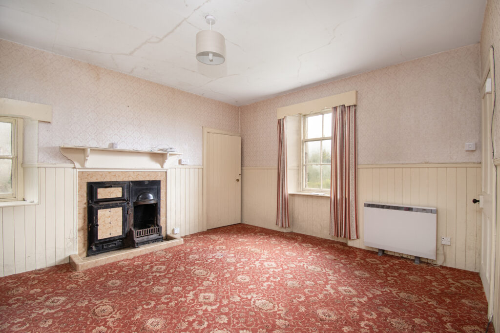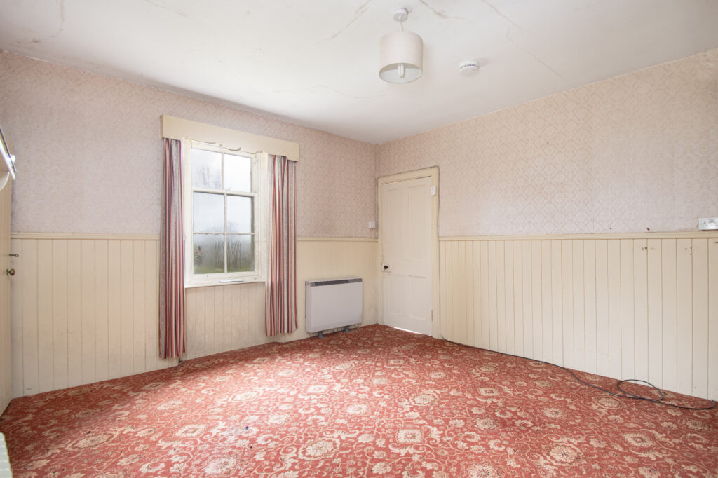 Spacious lounge with single glazed split pane sash and case window. Fireplace with tiled hearth and wooden