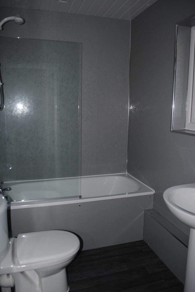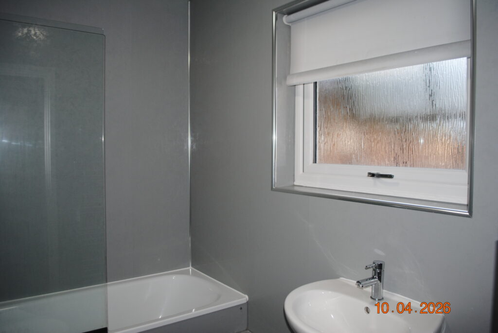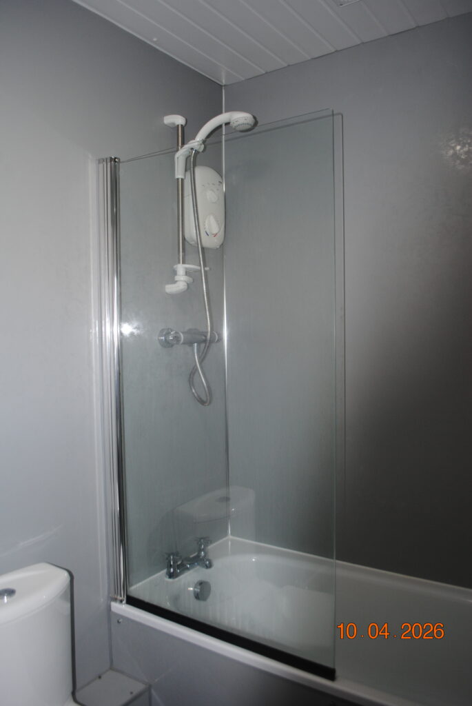 There is a double bedroom with ample built-in storage, along with a bathroom featuring a shower over the bath.